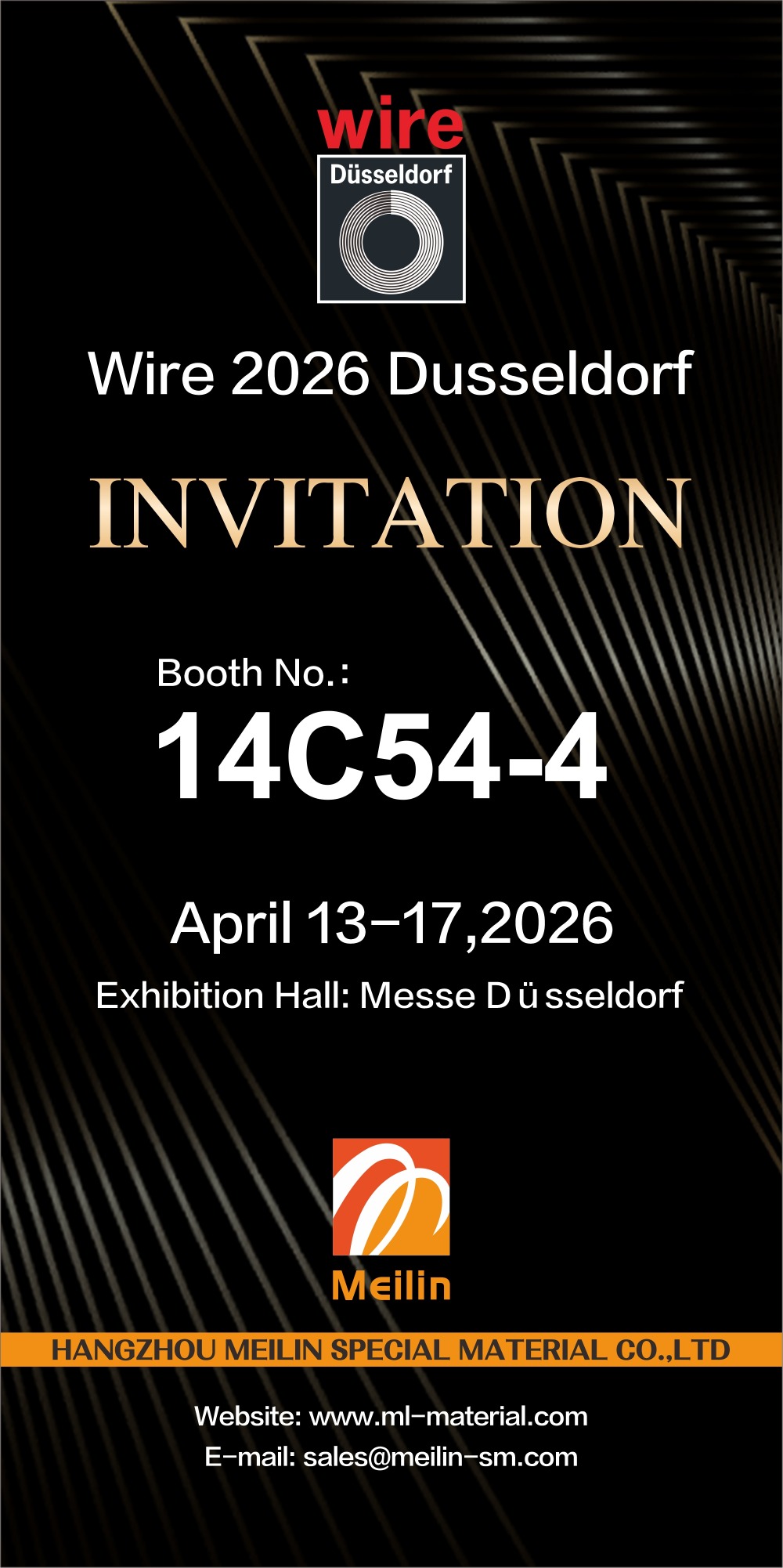Wire 2026 Düsseldorf, a premier global event for the wire and cable industry, will be held from April 13 to 17, 2026 at Messe Düsseldorf in Germany. Hangzhou Meilin New Material Technology Co., Ltd. will present its full range of cable material products at the exhibition, located at Booth No. 14C54-4.